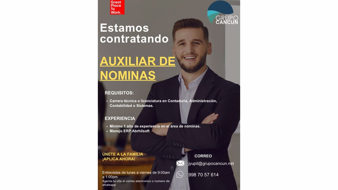 Buscamos un Auxiliar de Nóminas para incorporarse a nuestro equipo en Servicios Administrativos Grupo Cancún.